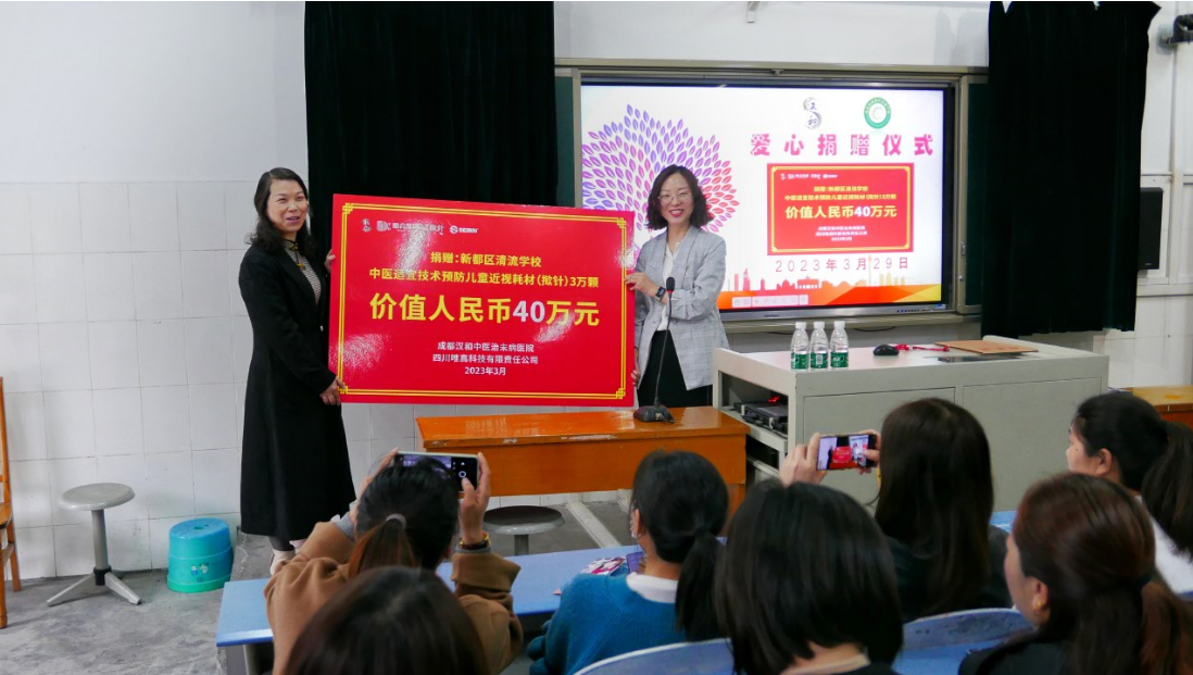 活動最后,舉行了愛心捐贈儀式。唯高集團向?qū)W校捐贈了價值40萬元的預(yù)防兒童近視中醫(yī)技術(shù)耗材撳針,共計3萬顆。全方位助力學(xué)校開展近視防控工作,充分發(fā)揮中醫(yī)藥改革試驗基地的優(yōu)勢,服務(wù)于轄區(qū)內(nèi)的兒童眼健康。會上,學(xué)校黨支部書記、校長劉元紅接收了唯高集團副總經(jīng)理朱蕓女士交予的捐贈牌。劉校長代表學(xué)校向唯高集團表示感謝,朱蕓女士表示希望通過開展這樣有意義的活動,帶動更多的家長和學(xué)生重視近視預(yù)防,也期待未來孩子們都有更加明亮的眼睛。